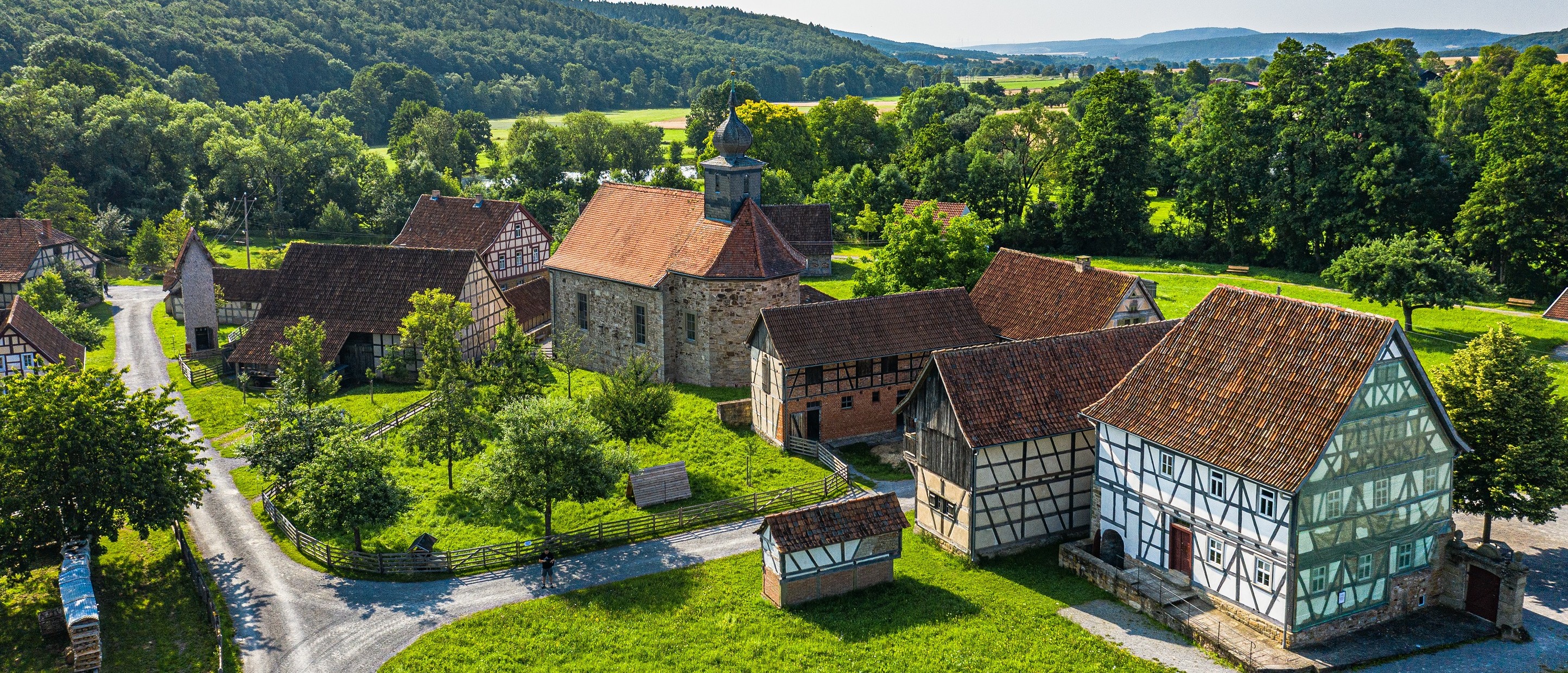 Historische Gebäude und Kulturlandschaft bilden im Fränkischen Freilandmuseum Fladungen eine Einheit. Copyright: Rhön GmbH, Foto: Alexander Martin