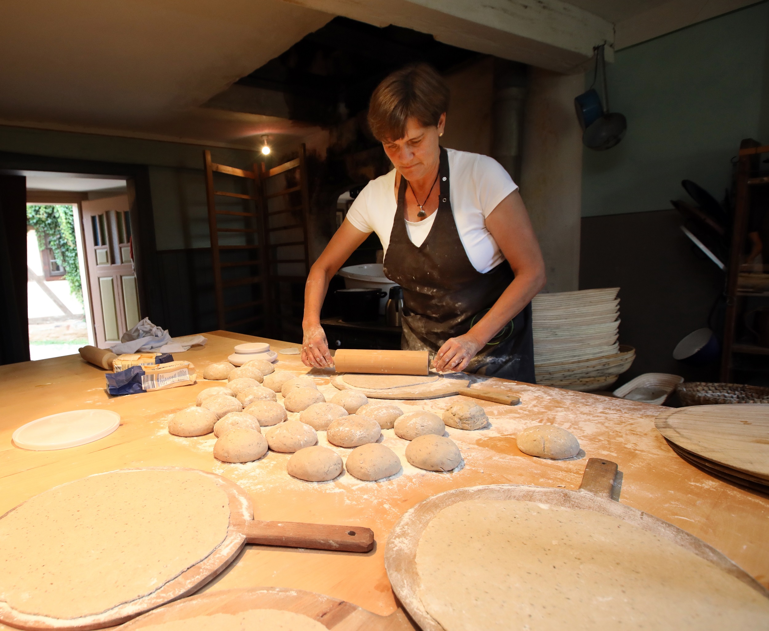 Früh am Morgen wird der Ofen des historischen Backhauses aus Oberbernhards mit Reisig eingeheizt, um knuspriges Holzofenbrot und Rhöner „Plootz“ zu backen. Ab 10 Uhr besteht die Gelegenheit, dem Team um Martina Seufert bei der Zubereitung des Backwerks über die Schulter zu schauen und sich nützliche Tipps für die eigenen Backvorhaben zu holen. Am Samstag ist ab ca. 13.30 Uhr frisches Bauernbrot zum Mitnehmen erhältlich. Am Pfingstmontag werden ab der Mittagszeit herzhaft belegte Brotfladen am Backhaus angeboten, jeweils solange der Vorrat reicht.