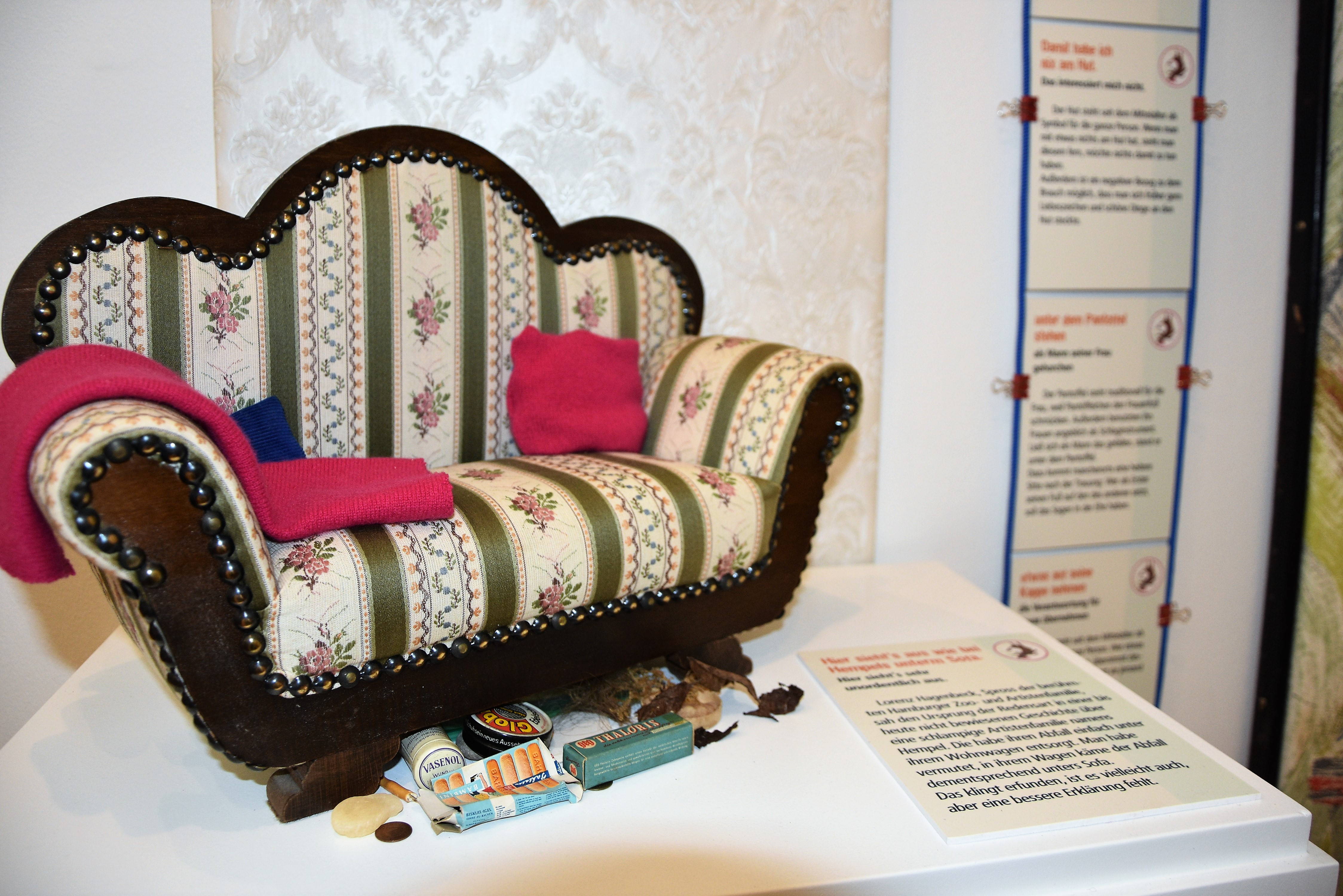 Das Publikum erwarten charmant hintergründige Illustrationen der Künstlerin Marei Schweitzer, liebevoll detailreich eingerichtete Miniatur-Schaukästen inszeniert als Suchspiel für Groß und Klein. Mitmachstationen wie Magnetwand, Fadenspiel und Schattentheater sorgen zusätzlich auf einer Ausstellungsfläche von 120 Quadratmetern für Erheiterung. So erfährt man zum Beispiel, wie es bei Hempels unterm Sofa aussieht und in der nachgebauten Küche sieht es aus wie Kraut und Rüben, und dann gibt es noch einen Katzentisch und vieles mehr.