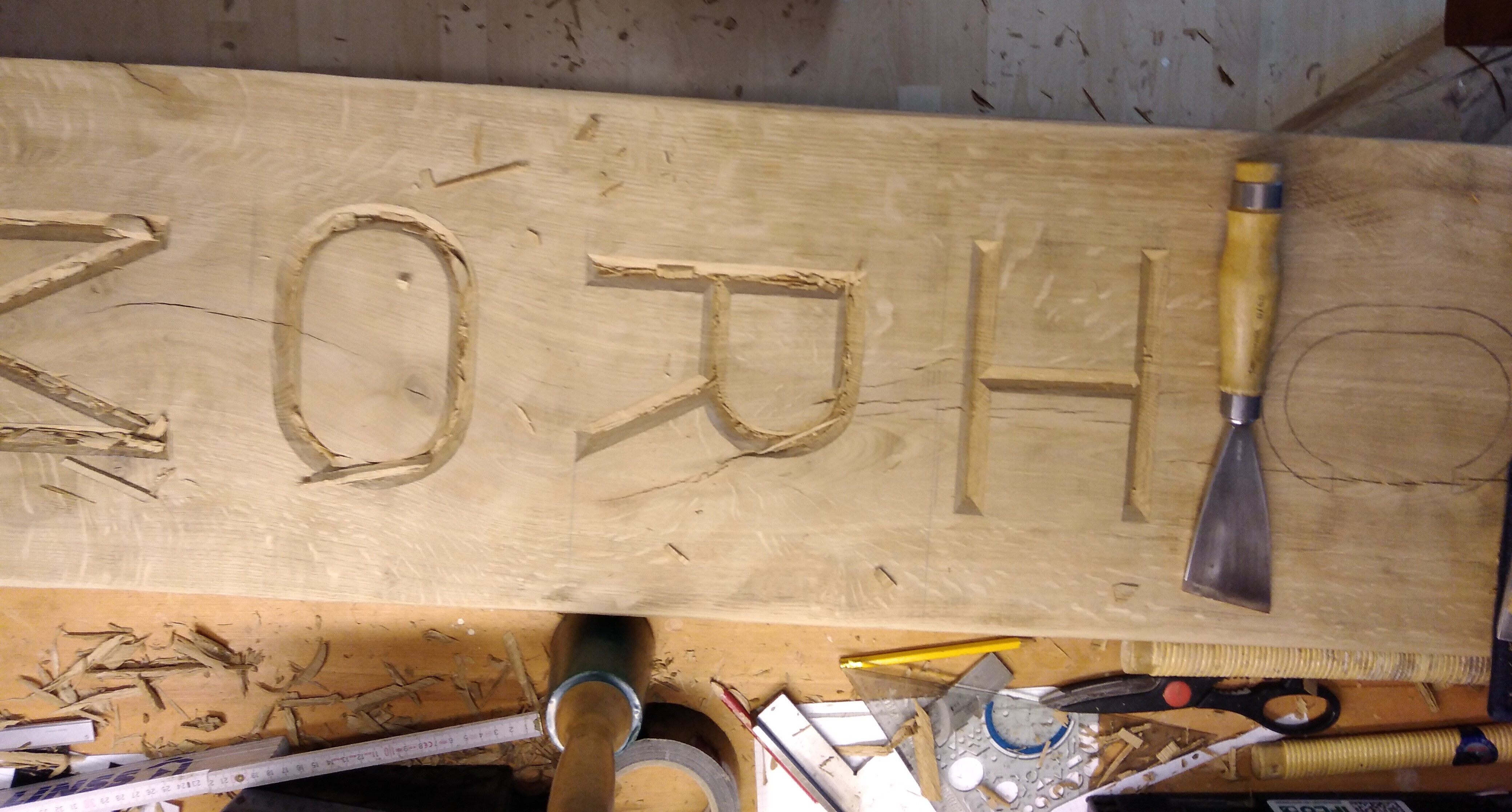Das Künstlerkollektiv Rhön zu Gast im Freilandmuseum Fladungen: Mit dem Schriftschnitzen in Holz nimmt Bildhauerin Sonja Wiesner Bezug auf die Fachwerkinschriften historischer Häuser. Foto: Sonja Wiesner