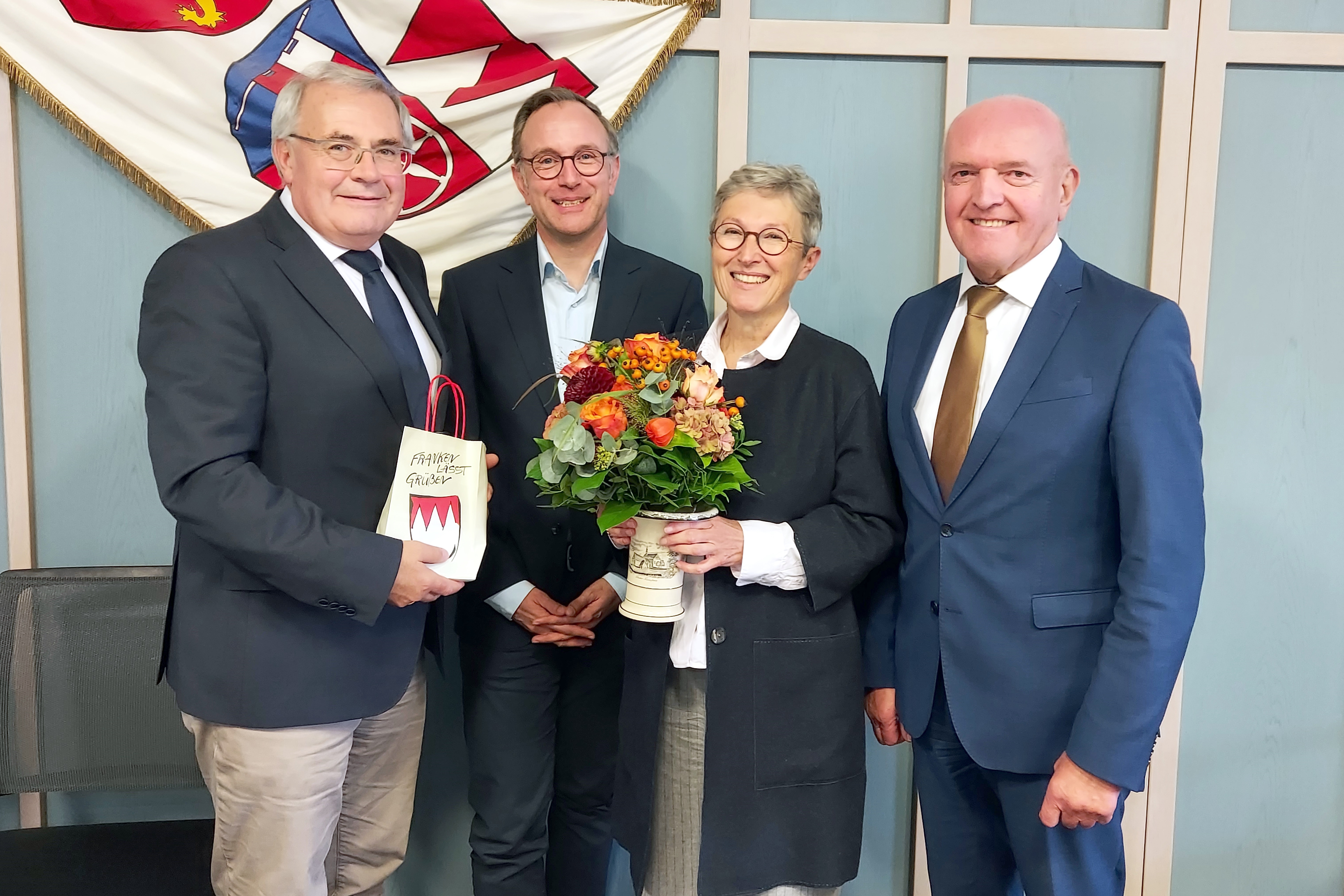 v. l. n. r. Bezirkstagspräsident Stefan Funk (Zweckverband Fränkisches Freilandmuseum Fladungen), Niklas Hertwig, Ariane Weidlich und Landrat Thomas Habermann (Zweckverband Fränkisches Freilandmuseum Fladungen) bei der Verabschiedung der Museumsleiterin Ariane Weidlich am 17. Oktober 2024 in Würzburg. Foto: Patricia Linsenmeier