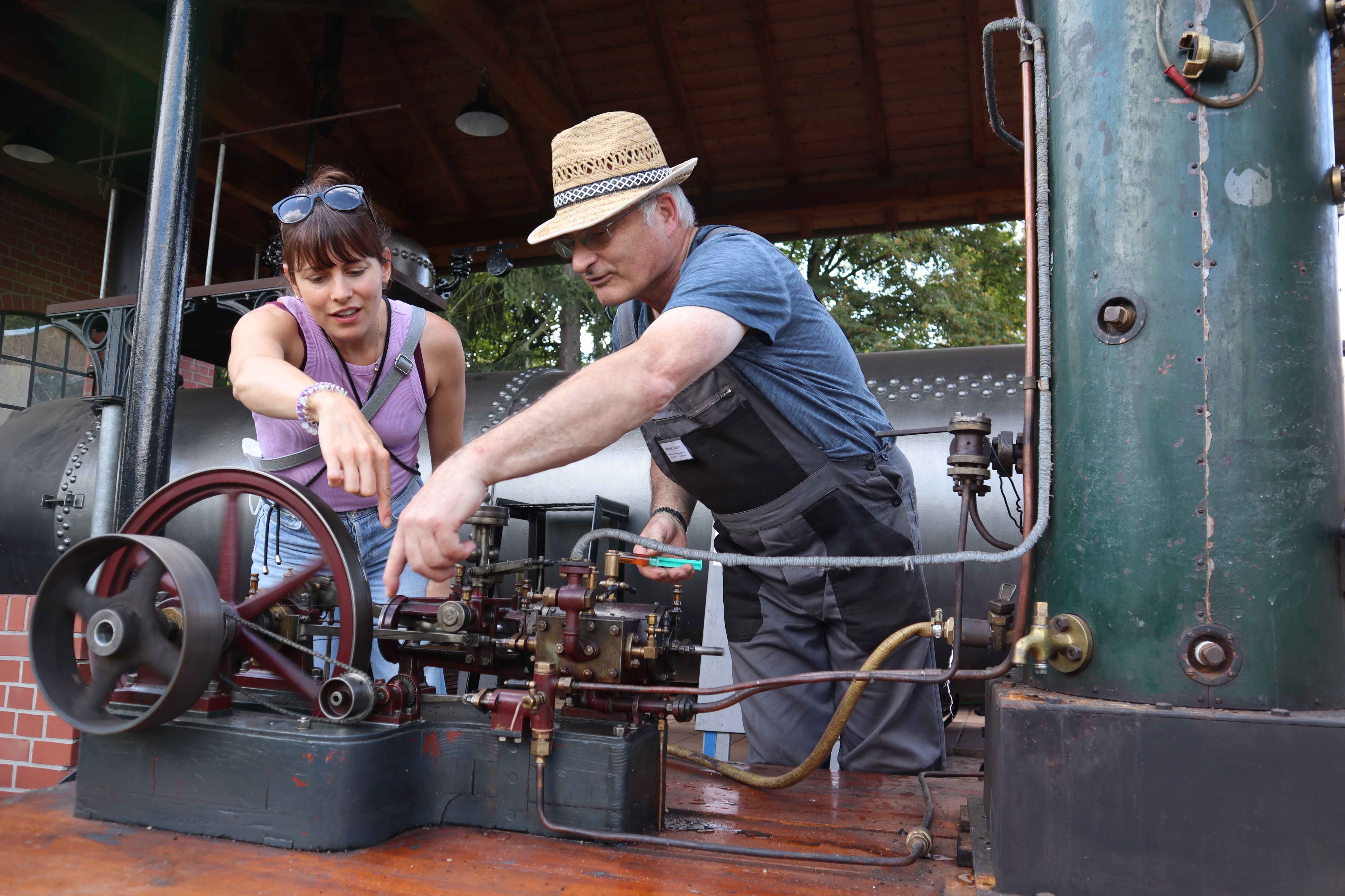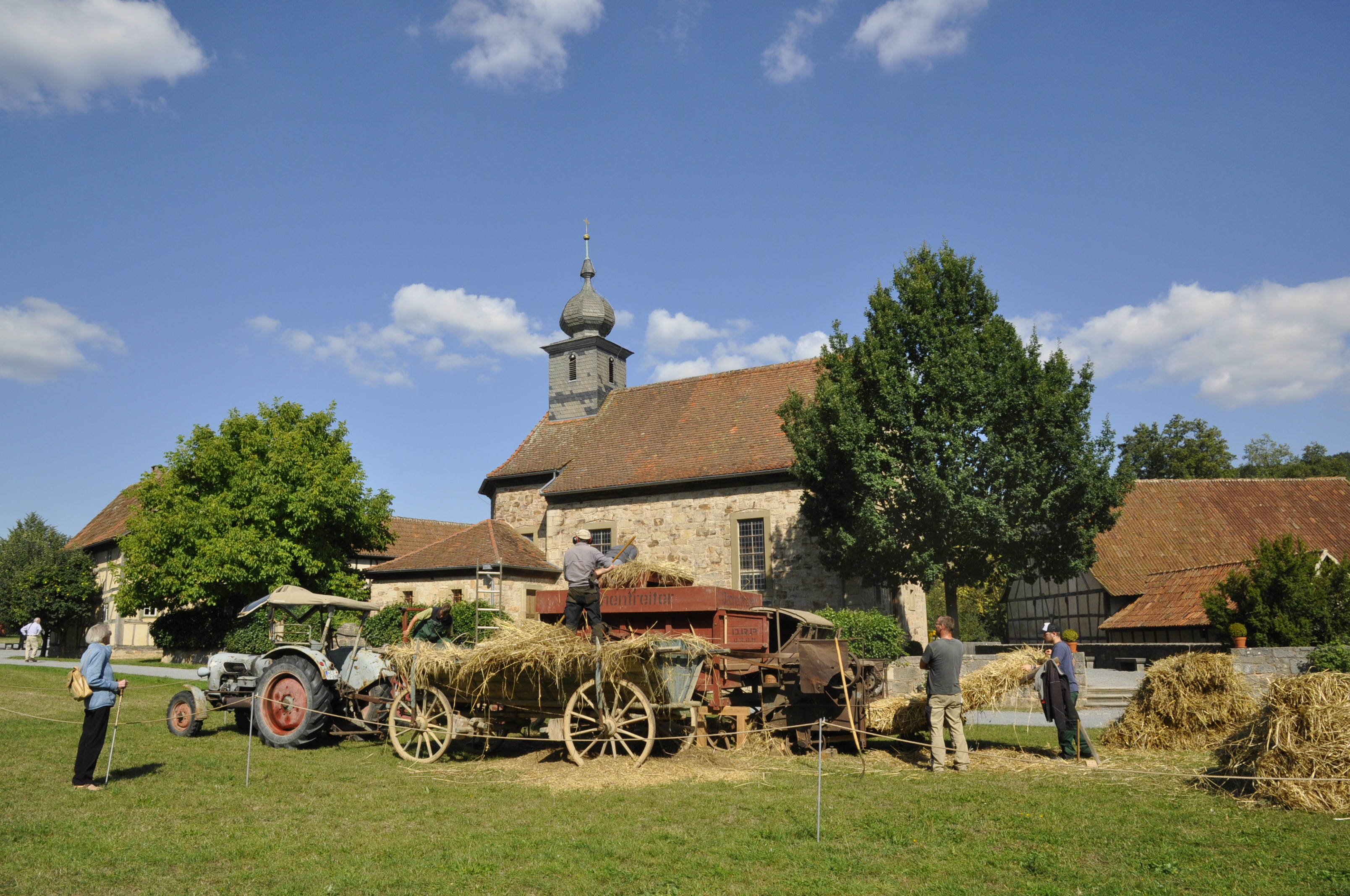 Zwei ganz besondere Attraktionen bringt der Förderverein Dampfmaschinenmuseum Hanau-Großauheim mit: Ein acht Tonnen schwerer Dampftraktor von 1896, ursprünglich als Dampfwalze gebaut, treibt die historische Dreschmaschine des Museums an. So wird die Zeit der Dreschkolonnen wieder lebendig, die mit ihrer Lokomobile im Herbst von Hof zu Hof zogen. Eine Kleindampfmaschine von 1924 setzt eine Drehbank in Gang und vermittelt eindrucksvoll die Faszination der Maschinenkraft von einst. Ergänzt wird das Technikprogramm durch die Präsentation von Lanz-Traktoren aus der Museumssammlung, darunter ein weiteres Highlight – der Bulldog HL 12 von 1928.