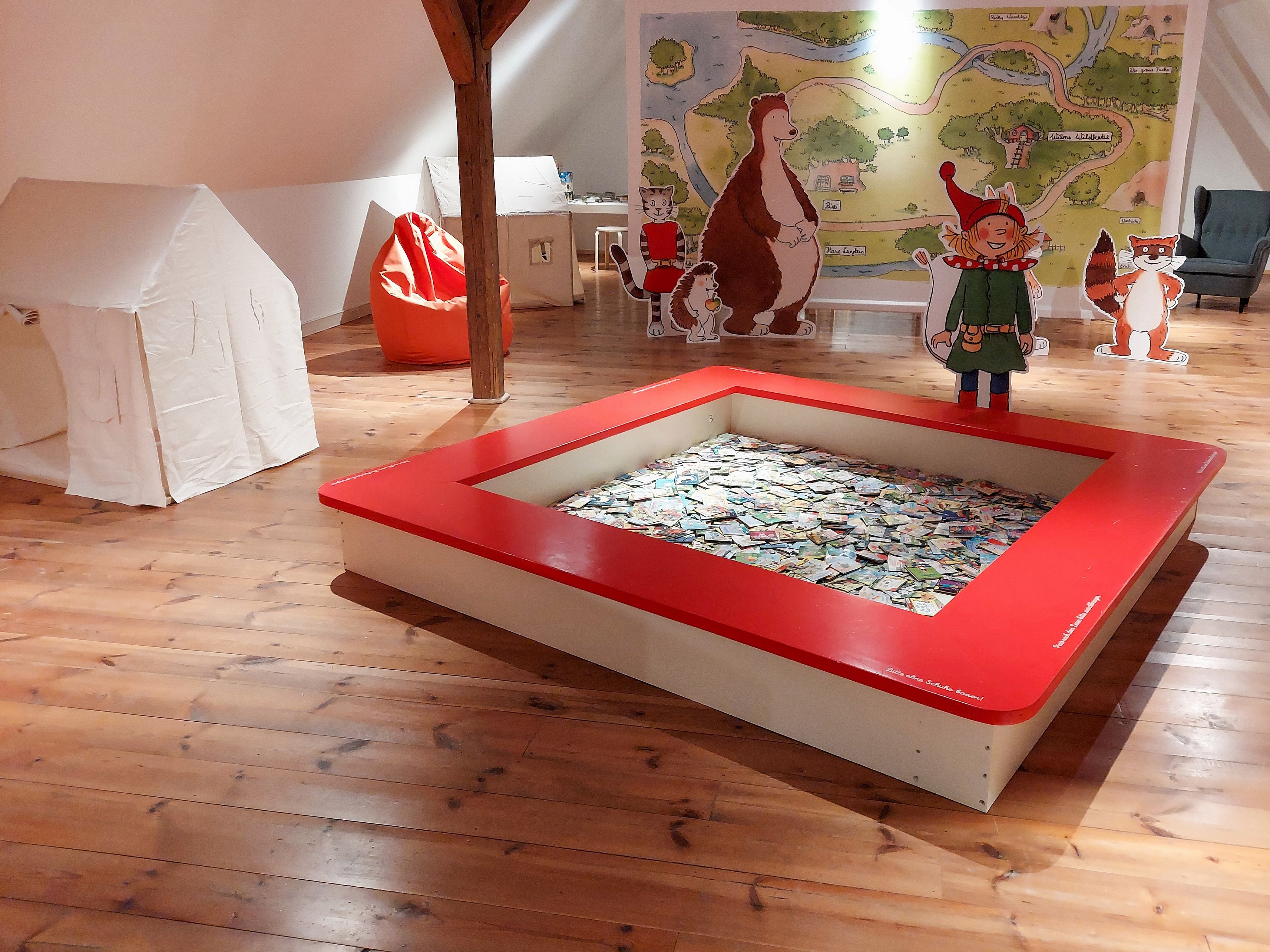 In der Familienausstellung können sich die Besucherinnen und Besucher auf vielfältige Weise mit der Bilderbuchreihe beschäftigen. In einem „Pixi-Bad“ können alle ihr Pixi suchen und selbst lesen oder sich vorlesen lassen – auf bequemen Sitzsäcken oder in kuschligen Zelten.
