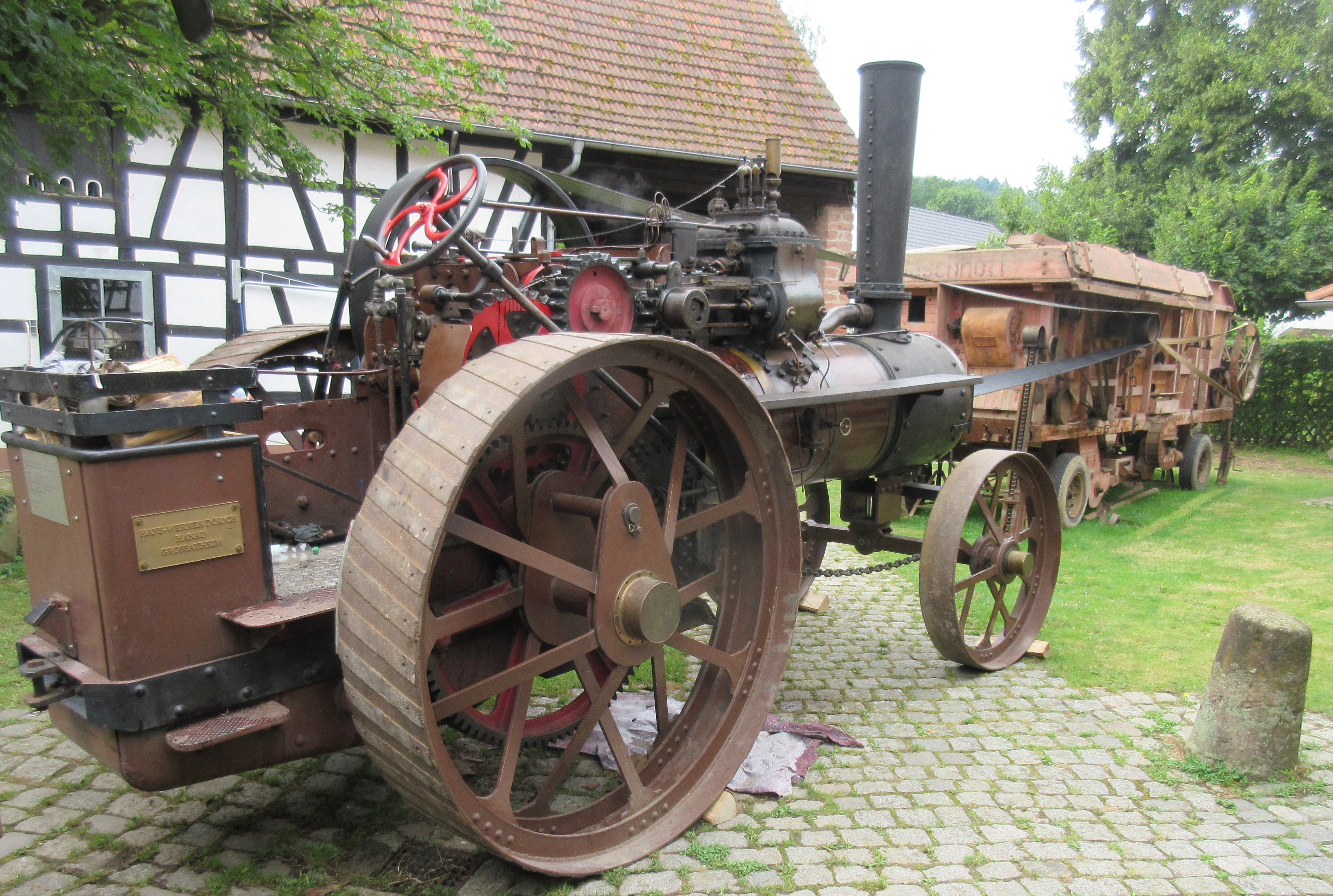 Zwei ganz besondere Attraktionen bringt der Förderverein Dampfmaschinenmuseum Hanau-Großauheim mit: Ein acht Tonnen schwerer Dampftraktor von 1896, ursprünglich als Dampfwalze gebaut, treibt die historische Dreschmaschine des Museums an. So wird die Zeit der Dreschkolonnen wieder lebendig, die mit ihrer Lokomobile im Herbst von Hof zu Hof zogen. Eine Kleindampfmaschine von 1924 setzt eine Drehbank in Gang und vermittelt eindrucksvoll die Faszination der Maschinenkraft von einst. Ergänzt wird das Technikprogramm durch die Präsentation von Lanz-Traktoren aus der Museumssammlung, darunter ein weiteres Highlight – der Bulldog HL 12 von 1928.
