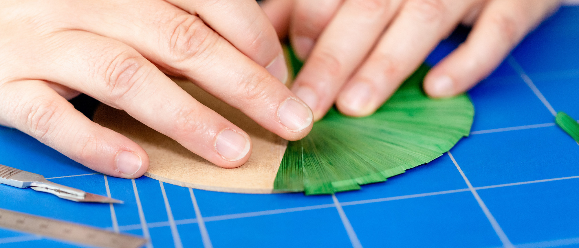 • Hände arbeiten an einem Strohmarketerie-Werk