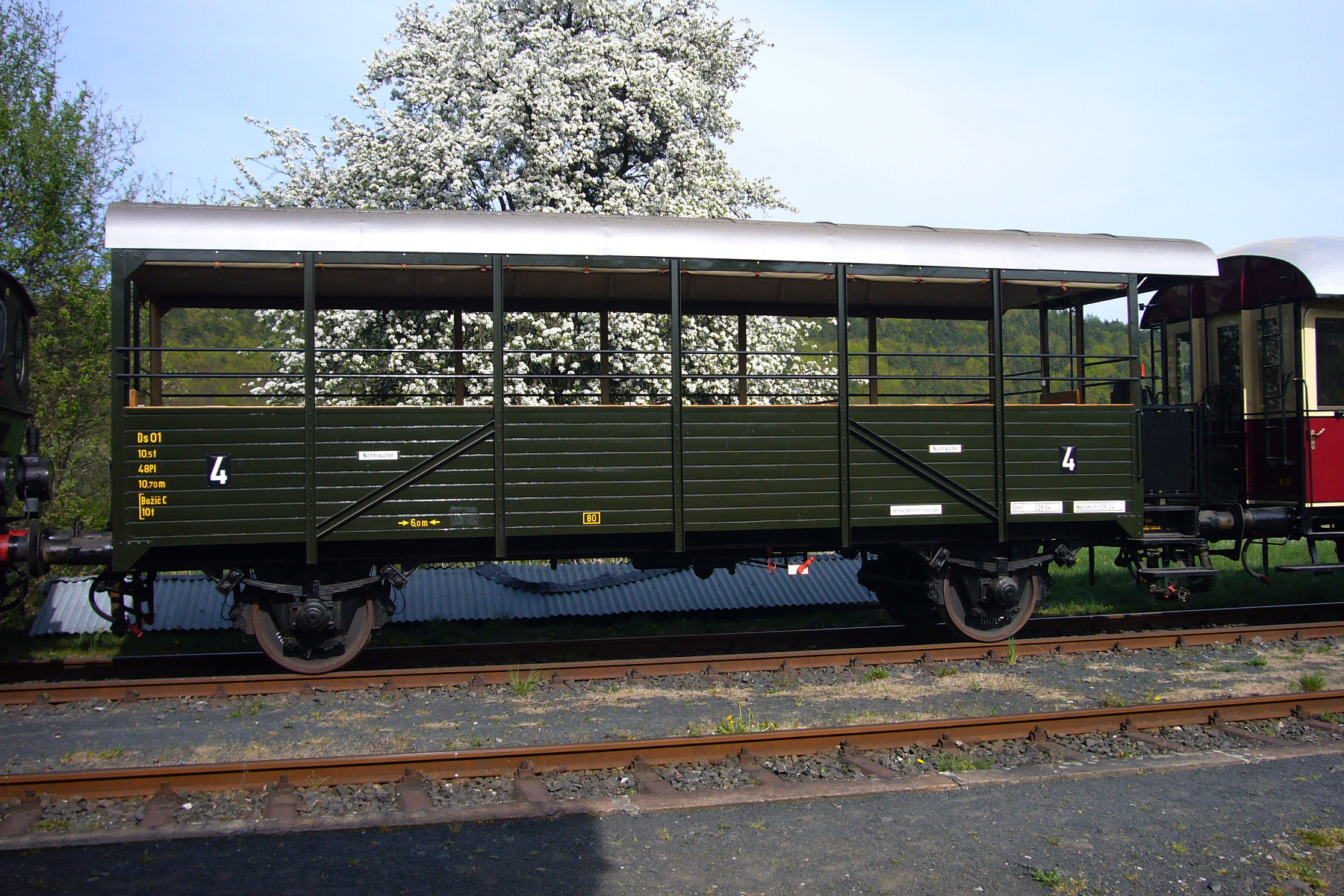 | Der Wagen ist ein umgebauter Packwagen tschechischer Herkunft und dient in den Sommermonaten bei schönem Wetter dazu, den Fahrgästen neben der frischen Rhönluft auch die Dampfzugatmosphäre möglichst nahe zu bringen. Nicht den Holzbänken, sondern dem geringen Witterungsschutz ist die Zuordnung zur vierten Klasse zuzuschreiben. | |