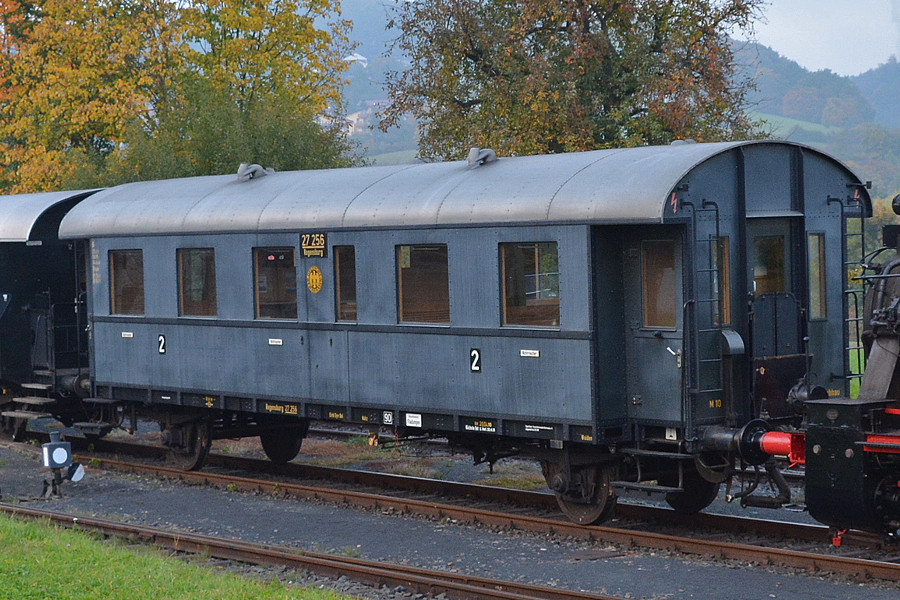 | Der Wagen wurde zu Beginn des neuen Jahrtausends aus einem Bauzugwagen neu aufgebaut. Die Inneneinrichtung wurde der Originalausstattung entsprechend gestaltet. Die Wagen dieser Bauart weisen einen Holzaufbau auf und waren ursprünglich der vierten Klasse zugeordnet und dafür vorbereitet, Verwundete auf Tragen zu transportieren. Aus diesem Grund sind die Eingangstüren mit einem zweiten Flügel ausgestattet, der dafür geöffnet werden kann und die Bühnengeländer sind niedriger ausgeführt als üblich. Mit Abschaffung der vierten Klasse 1928 wurden diese Wagen ohne Veränderung der Inneneinrichtung der dritten Klasse zugeordnet. Äußerlich entspricht der Wagen dem Zustand bei der Deutschen Reichsbahn Gesellschaft zu Beginn der 1930er Jahre. | |